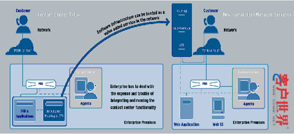 以國外的托管服務若建立在800號于C4/C5局用交換機上,許多用戶可以不用建制本地的排隊機就可以實現(xiàn)托管服務。目前國內的運營商若要直接在C4/C5局用交換機因為沒有C4/C5的CTI服務器可以連接,所以有其困難的地方,只能采用800號智能網(wǎng)新增業(yè)務與本地企業(yè)排隊機連網(wǎng)的方式來完成。但國內運營商未來都會朝向NGN,采用軟交換的方向來看,企業(yè)可能再也不用采購本地排隊機,對于呼叫中心托管的業(yè)務是一個很好的方向。