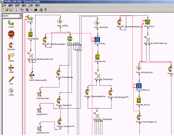 GVP提供了界面友好的功能強(qiáng)大的語音應(yīng)用開發(fā)工具-Genesys Studio,其中預(yù)定了豐富的控件,用來實(shí)現(xiàn)菜單語音播報(bào)、DTMF收集以及對(duì)數(shù)據(jù)庫(kù)查詢等諸多功能。通過拖放的方式就可以快速的隨心所欲地設(shè)計(jì)出你所需要的語音邏輯應(yīng)用流程,最終編譯產(chǎn)生用于發(fā)布的ASP或者JSP頁(yè)面。應(yīng)用之間可以彼此調(diào)用,提高了語音應(yīng)用的靈活性和可重用性。Genesys Studio還提供了靈活實(shí)用的調(diào)試工具,可以隨意設(shè)置斷點(diǎn)實(shí)時(shí)跟蹤流程的執(zhí)行情況,極大的方便了語音應(yīng)用流程的調(diào)試。