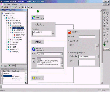 為了最大限度地方便用戶(hù), Visual Editor 為 IVR 腳本的編寫(xiě)提供了一整套可視化的圖形工具. 在它的集成開(kāi)發(fā)環(huán)境中, 你可以執(zhí)行定義一套語(yǔ)音文件, 定義和初始化一些變量, 定義 DSN 和一些記錄集, 加入新結(jié)點(diǎn)等操作.