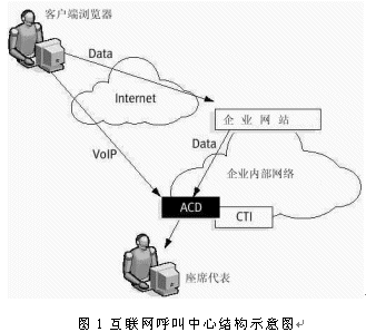 互聯(lián)網(wǎng)呼叫中心是在互聯(lián)網(wǎng)技術飛速發(fā)展的基礎上所產(chǎn)生的。對于客戶而言,完全的互聯(lián)網(wǎng)呼叫中心和傳統(tǒng)呼叫中心最大的區(qū)別就在于客戶無需電話,只要從一個Web站點就可以直接進入互聯(lián)網(wǎng)呼叫中心。這樣一來,呼叫中心就從傳統(tǒng)形式上的“撥號-交談(Dial to Talk)”發(fā)展到現(xiàn)代形式的“點擊-交談(Click to Talk)”。典型的互聯(lián)網(wǎng)呼叫中心結構如圖1所示。
