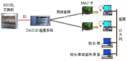 DAS120與億景座席卡MAC配合使用,可使系統(tǒng)的優(yōu)越性發(fā)揮到最大。MAC卡提供的強大功能(收發(fā)DTMF和450HZ信號音,語音錄放等)有效地簡化系統(tǒng)軟件的設計,并可降低系統(tǒng)成本,如EXCEL交換機可不用配置DSP卡,IVR可簡化等。還可以有效地降低交換機的處理負荷,提高話務處理能力。