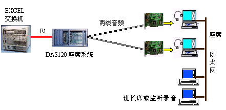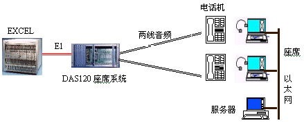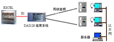 因為EXCEL交換機不能提供模擬接口。DAS120的出現(xiàn)很好地彌補了其不足。它與EXCEL交換機采用4個E1連接,可以簡潔實現(xiàn)PCM信號轉模擬信號引出到座席。E1接口的信令可選配為隨路信令CAS和透明通道Clear