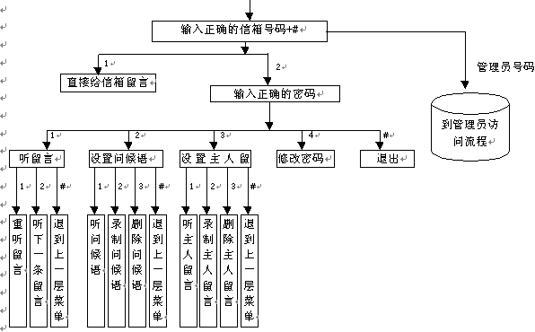 3). 管理員可完成的功能有:①開(kāi)啟信箱,②關(guān)閉信箱,③修改用戶密碼,④修改管理員密碼,⑤錄制電腦話務(wù)員提示語(yǔ),⑥設(shè)定系統(tǒng)時(shí)間,⑦查號(hào)臺(tái)錄音