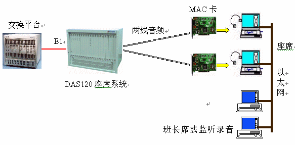 DAS120與億景座席卡MAC配合使用,可使系統(tǒng)的優(yōu)越性發(fā)揮到最大。MAC卡提供的強(qiáng)大功能(收發(fā)DTMF和450HZ信號(hào)音,語(yǔ)音錄放等)有效地簡(jiǎn)化系統(tǒng)軟件的設(shè)計(jì),并可降低系統(tǒng)成本,如EXCEL交換平臺(tái)可不用配置DSP卡,IVR可簡(jiǎn)化等。還可以有效地降低交換平臺(tái)的處理負(fù)荷,提高話(huà)務(wù)處理能力。