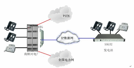 說(shuō)明:南椏河電廠在現(xiàn)有的IP網(wǎng)絡(luò)基礎(chǔ)上,利用IP中繼網(wǎng)關(guān)EEG與SAG32電信級(jí)模擬VoIP網(wǎng)關(guān)實(shí)現(xiàn)交換機(jī)的遠(yuǎn)程放號(hào),實(shí)現(xiàn)了發(fā)電站與電廠、省電力網(wǎng)、電信等的組網(wǎng),解決了實(shí)際的通信問(wèn)題。在方案中,具有組網(wǎng)簡(jiǎn)單,維護(hù)方便,通話質(zhì)量高等特點(diǎn),得到當(dāng)?shù)赜脩舻恼J(rèn)可。