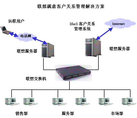 聯(lián)想IT 1for1客戶關系管理解決方案主要包括以下部分:服務器端的應用軟件采用1for1客戶關系管理系統(tǒng);服務器端采用聯(lián)想萬全工作組級和部門級服務器;客戶端推薦采用中高端商用電腦。