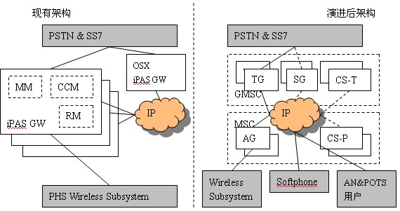 GW軟件改造而來,只需新增CS-P即可?偟膩碚f,核心網(wǎng)的演進只是增加CS-P、擴容CS-T、原有的iPAS GW軟件升級為TG/AG,就可以建立其一個具有多種終端接入能力的開放性多媒體VoIP移動軟交換網(wǎng)絡,而原有的PHS系統(tǒng)功能又不會受到影響。