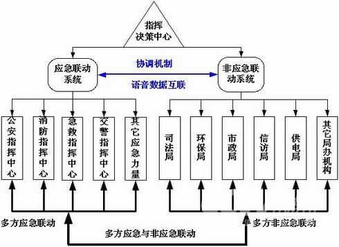 所謂“應(yīng)急與非應(yīng)急一體化聯(lián)動”,就是在應(yīng)急聯(lián)動和非應(yīng)急聯(lián)動的基礎(chǔ)上,通過先進(jìn)的技術(shù)手段實現(xiàn)應(yīng)急聯(lián)動系統(tǒng)與非應(yīng)急聯(lián)動系統(tǒng)的高度整合,無縫聯(lián)接,并通過相應(yīng)的協(xié)調(diào)機制,實現(xiàn)各種應(yīng)急處置力量和非應(yīng)急處理部門的一體化的協(xié)同與聯(lián)動,以共同應(yīng)對和協(xié)調(diào)解決各種尤其是涉及多個方面的緊急或非緊急的事件和問題。