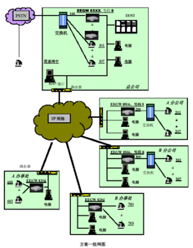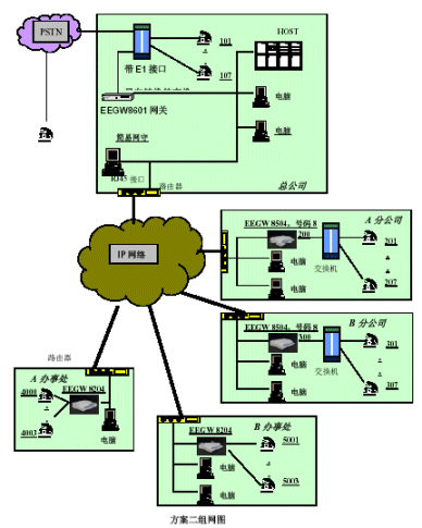 。。本方案有主要配置:總公司配備1臺EEGW8601E1網(wǎng)關(guān)、四個(gè)分公司分別配備1臺EEGW8504FXO網(wǎng)關(guān),四個(gè)辦事處分別配備1臺EEGW8204FXO網(wǎng)關(guān)。在總公司出可以安裝EEGK8001簡易網(wǎng)閘。