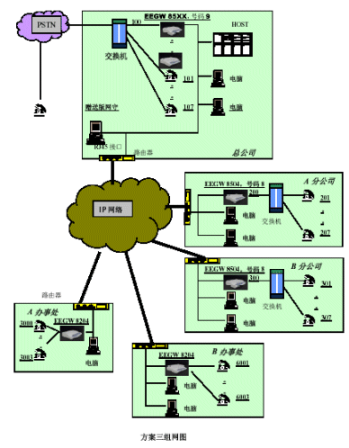 。。本方案有主要配置:總公司配備3臺EEGW8504FXO網(wǎng)關(guān)、四個(gè)分公司分別配備1臺EEGW8504FXO網(wǎng)關(guān),四個(gè)辦事處分別配備1臺EEGW8204FXO網(wǎng)關(guān)。在總公司出可以安裝EEGK8001簡易網(wǎng)閘。