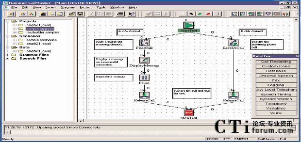 呼叫中心測(cè)試的第一步就是要?jiǎng)?chuàng)建要被測(cè)試的業(yè)務(wù)的呼叫流程圖。可以通過一個(gè)含有標(biāo)準(zhǔn)呼叫流程圖標(biāo)庫(kù)的呼叫流程圖形編輯器創(chuàng)建呼叫流程圖。每個(gè)呼叫流程的圖標(biāo)都包含一段Hammer