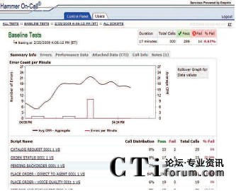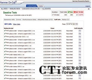 只需使用一個簡單易用的Web接入就可以和Empirix測試小組一起實時跟蹤測試進度。此外,還同時可以查看測試結(jié)果、發(fā)生失敗的類型和導致失敗發(fā)生的測試流量。通話全程記錄功能可以用來記錄相關通話,從而捕獲和幫助診斷發(fā)生失敗的根源。可以參考下列圖表: