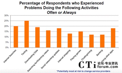 調(diào)查顯示,超過2/3的美國(guó)智能手機(jī)用戶從事一些最常見的活動(dòng)時(shí),遭遇了網(wǎng)絡(luò)服務(wù)問題,包括互聯(lián)網(wǎng)搜索、數(shù)據(jù)下載、搜尋或觀看視頻和社交網(wǎng)絡(luò)。此外,在調(diào)查中發(fā)現(xiàn),當(dāng)他們遇到服務(wù)和中斷問題時(shí),消費(fèi)者把責(zé)任歸罪于他們的移動(dòng)網(wǎng)絡(luò)運(yùn)營(yíng)商商(MNO)。事實(shí)上,幾乎所有被調(diào)查的智能手機(jī)用戶的一半,由于他們的體驗(yàn)問題抱怨他們的移動(dòng)網(wǎng)絡(luò)運(yùn)營(yíng)商商(MNO)。