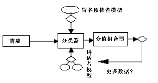 下圖說(shuō)明了Nuance軟件的處理流程。語(yǔ)音前端處理后,分類器將講話者的語(yǔ)音特性和有關(guān)的講話者和冒名頂替者模型進(jìn)行比較,產(chǎn)生分值。