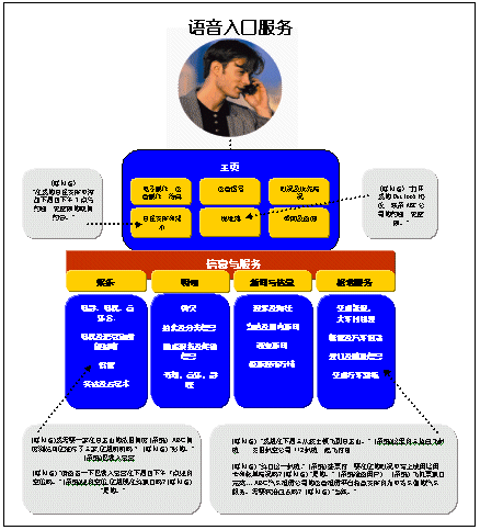 語音網(wǎng)最吸引人之處就在于它可以在一次通話中,同時(shí)處理多個(gè)任務(wù)。下圖表明一名商務(wù)人員是如何安排好與一個(gè)未來的商務(wù)旅行有關(guān)的一系列任務(wù)的。他獲取了對(duì)自己有用的信息,順利達(dá)成了一項(xiàng)語音商務(wù)交易,接收個(gè)人信息和辦公室的幫助,并撥打電話所有這些都是在一個(gè)同步過程中完成的。