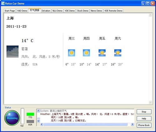 比方說這個關(guān)于空調(diào)問題,我們過去,空調(diào)的命令詞是“把空調(diào)打開,空調(diào)溫度提高3度。”現(xiàn)在我也可以這樣說,空調(diào)調(diào)高一點,我有點冷,也可以。就是你在車里邊完全可以用你自己的語言來說你想干的事。比如說,前邊你不知道明天天氣會怎么樣,人一般都會想想,明天天氣如何,或者是告訴我天氣預(yù)報。但是你也可以這樣說。明天會下雨嗎?也可以這樣說。或者你這樣說,你說,今天大盤怎么樣。完全是用自然語言來說。堵不堵車,“查詢交通情況!边@就是,實際上可以有各種不同的說法來完成這個任務(wù),這是我們自然語言的一個演示。