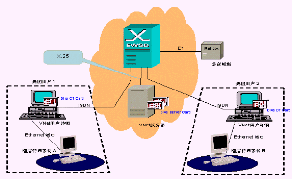 圖中集團(tuán)用戶1與集團(tuán)用戶2內(nèi)部使用了配置Eicon 公司Diva CT Card的Vnet系統(tǒng)用戶終端,同時(shí)接入ISDN設(shè)備與EWSD交換機(jī)連接,信號(hào)通過EWSD交換機(jī)響應(yīng)給配置Eicon