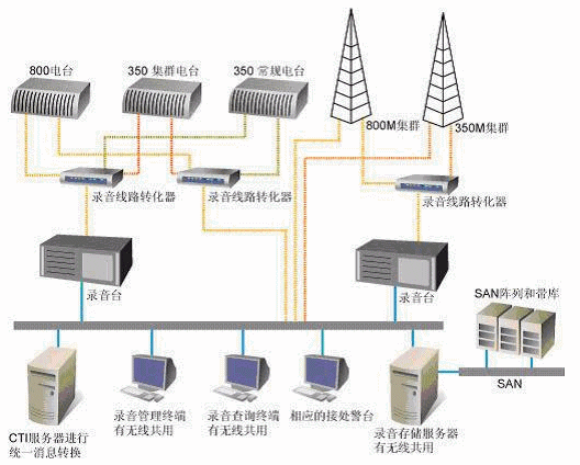 系統(tǒng)對無線通訊部分的800M TETRA集群、350M模擬集群、TETRA基地臺、350M常規(guī)基地臺、350M集群電臺等進(jìn)行錄音。