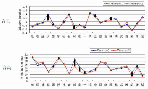 MSRA的研究人員發(fā)現(xiàn):兩遍錄音的整體音高分布是相當(dāng)一致的。但是,如果比較兩遍錄音中相應(yīng)單元的音高,也會看到明顯的差異。也就是說,雖然受到特定的上下文和語義表達(dá)的約束,音段音高的取值也有相當(dāng)大的變化范圍,其可變范圍可以大到所有音段的整體變化范圍的45%左右。