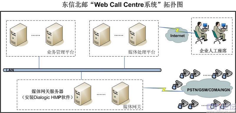 由于呼叫中心建設(shè)涉及技術(shù)十分專業(yè)、涉及領(lǐng)域也比較廣泛,必須投入巨大的資金購(gòu)買軟硬件設(shè)備,因此對(duì)于中小企業(yè)而言建設(shè)自有的呼叫中心顯得不切實(shí)際。正是基于這種情況,東信北郵開始采用Dialogic HMP系統(tǒng)軟件建設(shè)呼叫中心系統(tǒng),以托管方式為中小企業(yè)提供呼叫中心服務(wù),即Web Call Centre服務(wù)。在項(xiàng)目建設(shè)過(guò)程中,東信北郵需要慎重選擇媒體處理軟件方案,努力做到突破傳統(tǒng)硬件方案的約束,力爭(zhēng)在系統(tǒng)靈活性、系統(tǒng)成本、系統(tǒng)可管理性、開發(fā)周期等方面獲得突破。