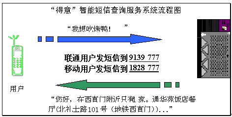 2004年4月15日和4月20日,擁有完全自主知識(shí)產(chǎn)權(quán)的語音與語言技術(shù)開發(fā)商和技術(shù)提供商北京得意音通技術(shù)有限責(zé)任公司(得意公司),在國際上率先把中文自然語言理解技術(shù)應(yīng)用在中國聯(lián)通和中國移動(dòng)短信服務(wù)平臺(tái)上,結(jié)合《精品購物指南》報(bào)社權(quán)威、全面的信息資源,開通了北京地區(qū)餐飲領(lǐng)域智能短信查詢服務(wù)(簡稱智能短信),并將進(jìn)一步支持互聯(lián)網(wǎng)平臺(tái)和WAP平臺(tái),陸續(xù)開通更豐富和更實(shí)用的智能信息服務(wù)。