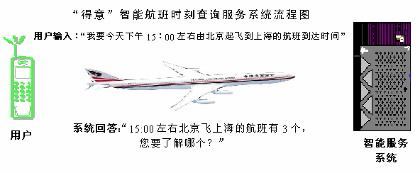 使用"得意"智能航班時刻查詢服務(wù)系統(tǒng),用戶可以通過短信/WAP/互聯(lián)網(wǎng)以自然語言的方式與服務(wù)系統(tǒng)進行互動,方便地查詢各個航班的時刻,以及相關(guān)的信息。當用戶在對話過程中遇到困難時,系統(tǒng)還會主動引導(dǎo)用戶獲取想要的信息,能為乘客和交通機構(gòu)提供很好的服務(wù)手段,實現(xiàn)真正的"智能"。