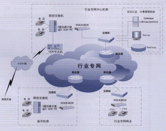 中心并設立一級計費認證及結算中心、網絡管理中心(VBMS),對網內電話集中管理和計費。通過在各地市機構原有的內部網絡基礎上增加數(shù)臺VOCABOX實現(xiàn)語音終端接入,并在地市機構通過帶FXO接口的VOCABOX實現(xiàn)內部IP電話與內部電話網絡的呼叫轉接,網絡拓撲連接如下圖所示