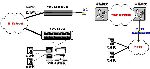 通過(guò)在本地IP電話網(wǎng)絡(luò)內(nèi)增加一臺(tái)或數(shù)臺(tái)網(wǎng)關(guān)(VOCASWITCH)直接連接到VoIP骨干網(wǎng)絡(luò)的網(wǎng)關(guān)的E1端口,實(shí)現(xiàn)IP電話呼叫轉(zhuǎn)接。物理連接如圖所示。