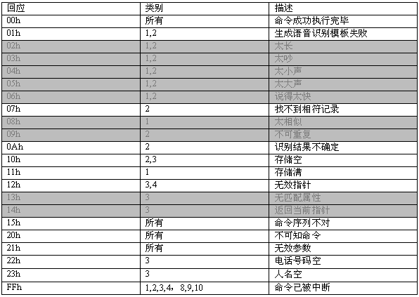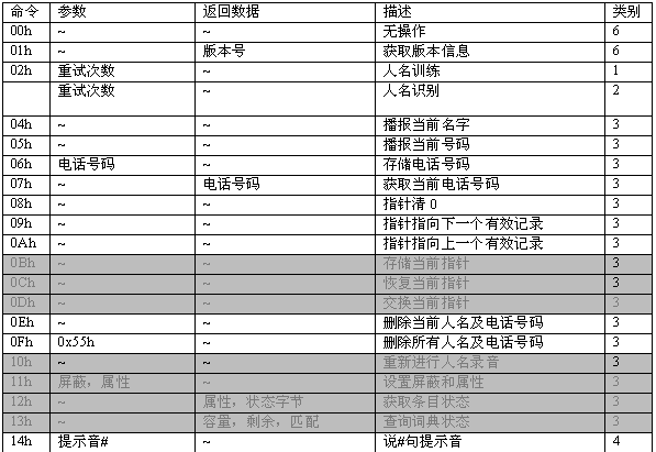 命令描述: 訓練一個名字。當增加一條電話本記錄時,應先執(zhí)行此命令。該命令會生成一個語音模板,同時產生一個長達2秒的名字錄音。在此命令成功執(zhí)行之后,MCPU接著發(fā)送06h命令增加電話號碼。如果沒有執(zhí)行06h命令,則該項記錄電話號碼為空。