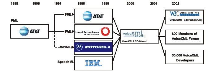 VoiceXML 是由IBM 、Lucent、Motorola 和AT&T 四家公司于2000年提出的一種應(yīng)用于語音瀏覽的標(biāo)記語言。如下圖所示,VoiceXML是各廠商多年經(jīng)驗積累的產(chǎn)物,VoiceXML