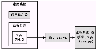 從上圖可以看出,座席端所有的業(yè)務(wù)處理都是在Web瀏覽器上進(jìn)行的,所以無論是利用原有系統(tǒng)還是新開發(fā)系統(tǒng),用戶都不必要關(guān)心座席的具體實(shí)現(xiàn)方式,要做的僅僅是編寫新的JSP,ASP等可訪問后臺(tái)業(yè)務(wù)的Web頁面,然后進(jìn)行簡單的配置就可以完成業(yè)務(wù)的擴(kuò)充功能。