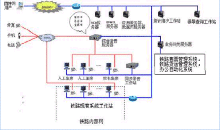 客戶利用電話、傳真、電子郵件、因特網(wǎng)、手機(jī)、網(wǎng)絡(luò)電話等撥打某統(tǒng)一特服號(hào)碼(如100xxxx)進(jìn)入鐵路客戶服務(wù)中心系統(tǒng),本系統(tǒng)依托鐵路各類業(yè)務(wù)技術(shù)支持系統(tǒng)和網(wǎng)絡(luò)系統(tǒng),通過人工受理或自動(dòng)語音服務(wù)等方式全天24小時(shí)不間斷地為旅客、貨主提供各種鐵路服務(wù);形成了對(duì)外服務(wù)于客戶,對(duì)內(nèi)管理、分析、決策系統(tǒng)相結(jié)合的新型客戶服務(wù)中心。