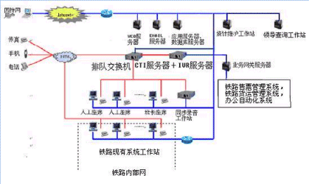 鐵路客戶服務(wù)中心系統(tǒng)主要是由帶語音板卡的計(jì)算機(jī)或排隊(duì)交換機(jī)、CTI服務(wù)器、IVR服務(wù)器、應(yīng)用服務(wù)器/數(shù)據(jù)庫(kù)服務(wù)器、人工座席系統(tǒng)等硬件設(shè)備和應(yīng)用軟件組成。它以電話服務(wù)為主要服務(wù)方式、結(jié)合計(jì)算機(jī)信息系統(tǒng)的資料數(shù)據(jù),為客戶提供全方位的服務(wù),包括業(yè)務(wù)查詢、業(yè)務(wù)咨詢、業(yè)務(wù)受理、投訴和建議、市場(chǎng)調(diào)查等功能。