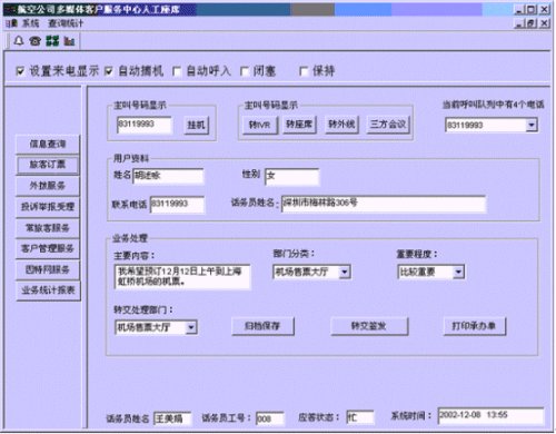 。。客戶打入電話后,當(dāng)系統(tǒng)的自動(dòng)語(yǔ)音應(yīng)答子系統(tǒng)無(wú)法解決客戶問(wèn)題時(shí),客戶可選擇人工服務(wù),由航空公司客戶服務(wù)代表直接接聽客戶電話,處理并解決客戶問(wèn)題。此時(shí)客戶同座席話務(wù)人員直接溝通,并同時(shí)記錄下該客戶的聯(lián)系方式,將相關(guān)數(shù)據(jù)添加入系統(tǒng)數(shù)據(jù)庫(kù);也可以在數(shù)據(jù)庫(kù)的支持下回答機(jī)場(chǎng)航班/航空貨運(yùn)信息及相關(guān)規(guī)定等的咨詢和疑問(wèn)、訂座/訂艙?蛻粢部梢赃x擇自動(dòng)語(yǔ)音服務(wù)方式,根據(jù)系統(tǒng)的語(yǔ)音提示輸入按鍵,選擇類別,將自己的投訴和建議以及自己的聯(lián)系方式信息以留言錄音的方式保存在系統(tǒng)中。系統(tǒng)同時(shí)還支持自動(dòng)傳真方式,客戶可以通過(guò)傳真機(jī)進(jìn)入本系統(tǒng),通過(guò)按鍵選擇傳真方式,將自己的意見建議等的文本內(nèi)容傳真給系統(tǒng),系統(tǒng)自動(dòng)接受并存入數(shù)據(jù)庫(kù)。