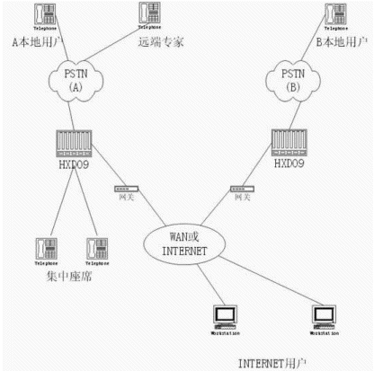 通過HXD09智能型可編程交換機構(gòu)建分布式呼叫中心(一個主呼叫中心,多個分呼叫中心),IPV 實現(xiàn)語音的遠程傳輸;實現(xiàn)遠程專家咨詢、集中管理座席的功能,其方式如下圖所示: