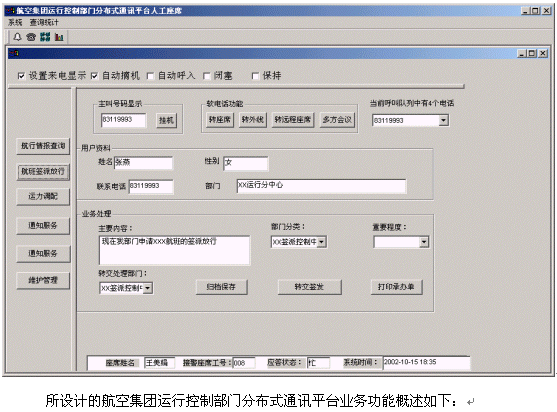 航空集團運行控制部門分布式通訊平臺將接入功能、導航功能、自動語音查詢功能、人工座席服務功能、話路轉(zhuǎn)接功能、信息資料處理緊密聯(lián)系起來。本地或異地有關(guān)部門/工作人員撥打特服電話號碼后,可以根據(jù)需要選擇人工服務、自動語音查詢、自動留言,并能夠在幾種服務中來回切換或轉(zhuǎn)接其它電話,也可以路由到遠程座席;所記錄的資料可以分門別類的進行統(tǒng)計并形成報表,供相關(guān)部門進行檢索查閱;意見處理完畢,可由人工座席主動呼叫本地或異地有關(guān)部門/工作人員,告知處理意見,形成閉環(huán)處理流程;可定期進行信息歸納、推演、預測等,從而得到信息深加工品。