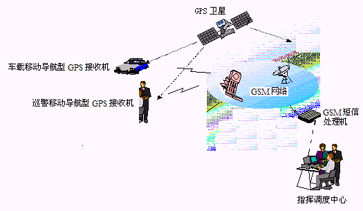 巡警利用移動終端(帶手機通信功能的GPS接收機)發(fā)出報警信號,通過GSM系統(tǒng)送到指揮調(diào)度中心。