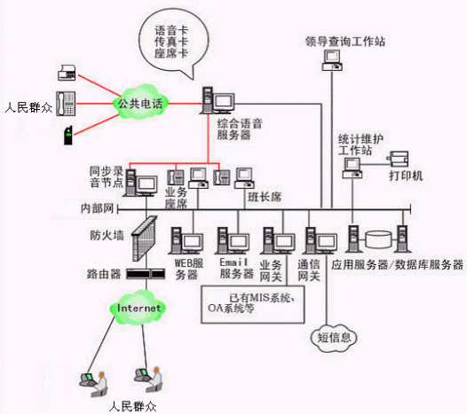 本系統(tǒng)物理結(jié)構(gòu)由排隊(duì)交換機(jī)、CTI服務(wù)器、IVR(交互式語(yǔ)音應(yīng)答)/IFR(交互式傳真應(yīng)答)服務(wù)器、業(yè)務(wù)代表座席(邏輯上分為:普通業(yè)務(wù)代表座席、專(zhuān)家座席、WEB座席等)、班長(zhǎng)座席、統(tǒng)計(jì)維護(hù)管理工作站、因特網(wǎng)(WEB)服務(wù)器、電子郵件(EMAIL)服務(wù)器、數(shù)據(jù)庫(kù)/應(yīng)用服務(wù)器、錄音留言工作站、領(lǐng)導(dǎo)查詢工作站、業(yè)務(wù)網(wǎng)關(guān)服務(wù)器、通信網(wǎng)關(guān)、網(wǎng)絡(luò)系統(tǒng)等和應(yīng)用軟件構(gòu)成。