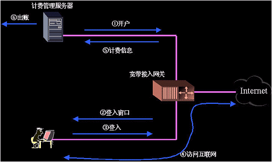 當(dāng)用戶選擇上網(wǎng)后。管理人員首先通過(guò)計(jì)費(fèi)管理服務(wù)器為用戶開戶。出用戶在打開瀏覽器試圖訪問(wèn)Internet時(shí)會(huì)彈來(lái)自接入網(wǎng)關(guān)要求登入的窗口。用戶輸入用戶名、密碼并可以選擇適合自己的資費(fèi)方式。輸入信息后接入網(wǎng)關(guān)將信息交由計(jì)費(fèi)管理服務(wù)器處理。計(jì)費(fèi)管理服務(wù)器驗(yàn)證通過(guò)后,向該用戶開放互聯(lián)網(wǎng)出口。在用戶訪問(wèn)互聯(lián)網(wǎng)的同時(shí),接入網(wǎng)關(guān)計(jì)錄下該用戶訪問(wèn)互聯(lián)網(wǎng)的相關(guān)信息,其中包括訪問(wèn)的時(shí)長(zhǎng)和數(shù)據(jù)流量。接入網(wǎng)關(guān)實(shí)時(shí)地向計(jì)費(fèi)管理服務(wù)器更新用戶的計(jì)費(fèi)信息,用戶斷網(wǎng)后計(jì)費(fèi)管理服務(wù)器計(jì)算用戶上網(wǎng)費(fèi)用。