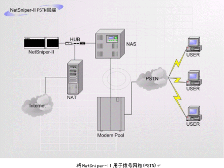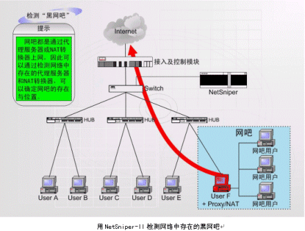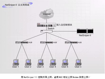 上圖中,NetSniper-II可以對網(wǎng)絡(luò)內(nèi)部各用戶進(jìn)行檢測,一旦發(fā)生某個用戶安裝代理服務(wù)器軟件,其他用戶通過該用戶的接口上網(wǎng)偷逃網(wǎng)費(fèi)的情況,或發(fā)現(xiàn)盜用MAC地址上網(wǎng)及通過Modem回?fù)苌暇W(wǎng)的情況,NetSniper-II即可定位這些用戶,并且采取通知系統(tǒng)管理員或自動封堵非法用戶等措施。