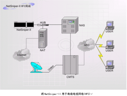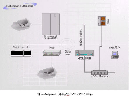 NetSniper-II也可以作為局端設(shè)備,用于xDSL(ADSL/VDSL)、PSTN(電話撥號網(wǎng)絡(luò))、HFC(有線電視網(wǎng)絡(luò))等。此時,NetSniper-II能夠有效的防止控制共享上網(wǎng)、盜用MAC地址上網(wǎng)和Modem回?fù)苌暇W(wǎng)的情況發(fā)生。下面兩個圖例指出了如何將NetSniper-II用于局端。