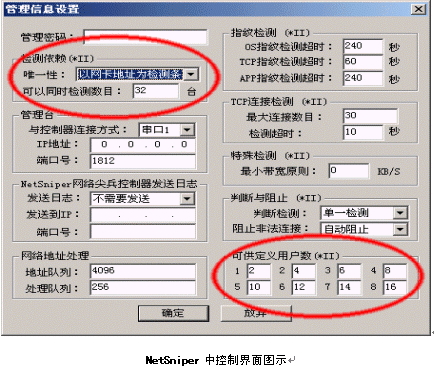 由上圖我們可以看出,NetSniper可以方便地根據(jù)用戶IP地址或MAC地址控制同一網(wǎng)口用戶數(shù)量,用戶數(shù)量控制可以分八級,包括單一用戶和無限用戶的缺省設(shè)置,一共十級。用戶數(shù)量按照按自己的意愿定義每一級用戶可以管理計(jì)算機(jī)的數(shù)量,準(zhǔn)確,靈活,是運(yùn)營商增加接入服務(wù)方式的強(qiáng)大基礎(chǔ)。