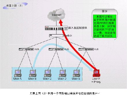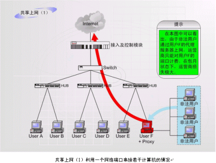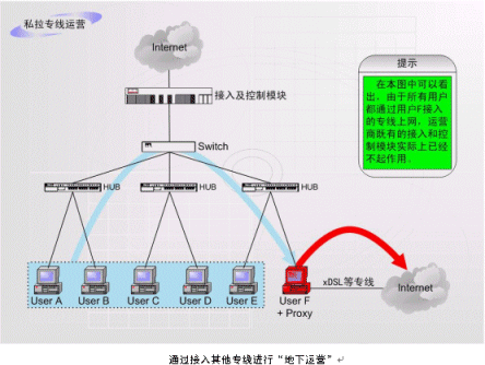 非法運(yùn)營情況之二:如上圖中的F用戶作為運(yùn)營商的合法包月用戶,上網(wǎng)服務(wù)開通以后,在自己的計(jì)算機(jī)中安裝代理服務(wù)軟件或者安裝路由器,這樣就可以隨時糾集若干住戶分?jǐn)偘沦M(fèi)用,甚至私設(shè)網(wǎng)吧。