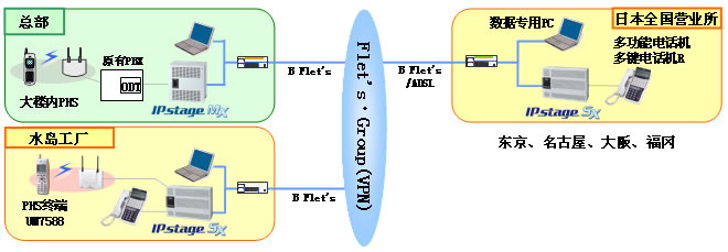 SX”通過(guò)SIP協(xié)作的IP電話(huà)系統(tǒng)。系統(tǒng)中所采用的“IPstage MX/SX”通過(guò)NTT西日本的VPN服務(wù)“Flet's・Group”相互連接,實(shí)現(xiàn)高音質(zhì)的內(nèi)線環(huán)境。使用內(nèi)線電話(huà)號(hào)碼進(jìn)行事業(yè)所之間的通話(huà)聯(lián)系,可以直接與想聯(lián)系的對(duì)象通話(huà),無(wú)需傳叫電話(huà)。進(jìn)而,由于工廠采用了沖電氣所制造的PHS終端“UM7588”,可以在工廠任何地方實(shí)現(xiàn)直接電話(huà)聯(lián)系。導(dǎo)入該系統(tǒng)后,即使業(yè)務(wù)場(chǎng)所分處幾地,也能成功實(shí)現(xiàn)員工間的迅速溝通。