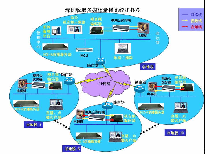 黑龍江省地稅采用了華為產(chǎn)品搭建了視頻會議系統(tǒng),實(shí)現(xiàn)了黑龍江省地稅和13個地市的電視電話會議功能,能夠?qū)崿F(xiàn)13個地市和省地稅之間的圖像、語音和數(shù)據(jù)的交互通訊,在此基礎(chǔ)上配置了銳取14臺DSS-R-C100多媒體錄播系統(tǒng)(省地稅與各市地稅各1臺),該系統(tǒng)可以輔助視頻會議系統(tǒng)完成視頻會議的錄制、直播和點(diǎn)播功能,錄制、直播和點(diǎn)播的內(nèi)容包括了主會場圖像、分會場圖像以及聲音和數(shù)據(jù)信號。