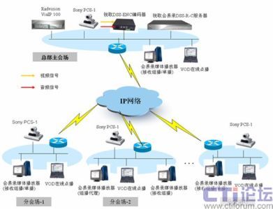 如上圖所示,攀鋼集團(tuán)視頻會(huì)議系統(tǒng)基于IP的組網(wǎng),MCU采用RADVISION VIAIP100綜合視訊交換平臺(tái),終端采用SONY