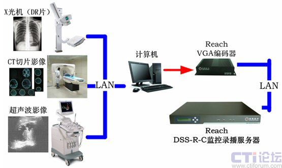 - 由于當前的大多醫(yī)療設備,如X光機、CT機均擁有網(wǎng)絡接口并支持,由計算機通過網(wǎng)絡即可采集醫(yī)療設備中的影像,并采用VGA編碼器采集計算機中的CR或DR片、CT片、演示文件(PPT、WORD、EXCEL);