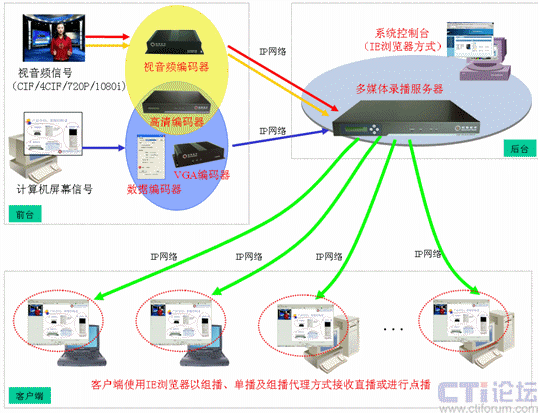 可通過單播或組播方式將會(huì)議現(xiàn)場的視頻、音頻、計(jì)算機(jī)動(dòng)態(tài)屏幕在網(wǎng)絡(luò)上進(jìn)行實(shí)時(shí)直播,用戶可通過IE瀏覽器登錄服務(wù)器實(shí)時(shí)接收直播的視頻、音頻和計(jì)算機(jī)動(dòng)態(tài)屏幕內(nèi)容。系統(tǒng)獨(dú)家支持組播代理功能,無須更改網(wǎng)絡(luò)設(shè)備的設(shè)置即可實(shí)現(xiàn)跨網(wǎng)段的組播。系統(tǒng)獨(dú)家支持文件組播功能,可將錄制好的文件在網(wǎng)絡(luò)上再次進(jìn)行組播。