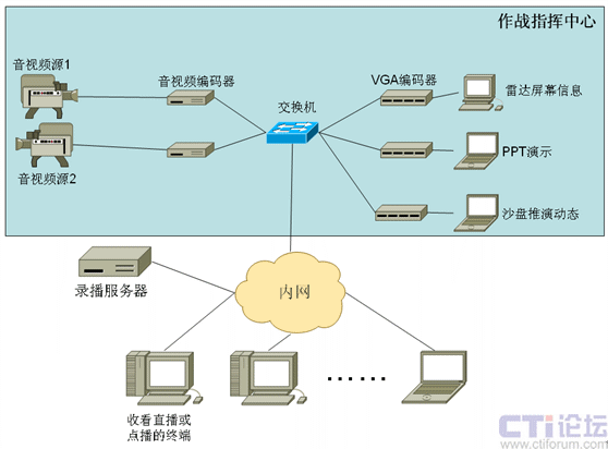 在軍隊(duì)系統(tǒng)中比較典型的應(yīng)用是軍隊(duì)作戰(zhàn)演習(xí)的錄播。軍隊(duì)中常會(huì)進(jìn)行軍事演習(xí)、網(wǎng)上模擬對(duì)抗訓(xùn)練,以此來增強(qiáng)現(xiàn)代化軍隊(duì)的作戰(zhàn)能力,演習(xí)指揮部在作戰(zhàn)指揮中心通過大屏等顯示設(shè)備全盤了解對(duì)抗雙方動(dòng)態(tài),以往缺乏有效的演習(xí)記錄手段,不利于事后分析及總結(jié)經(jīng)驗(yàn)教訓(xùn)。會(huì)易錄支持多路AV和VGA信號(hào)的同步組合錄制,可以把演習(xí)過程中作戰(zhàn)指揮中心顯示的信息進(jìn)行全面的錄制,如對(duì)抗雙方的視音頻信息、網(wǎng)上沙盤推演動(dòng)態(tài),雷達(dá)屏幕信息等內(nèi)容,同時(shí)也可以通過網(wǎng)絡(luò)將上述信息實(shí)時(shí)傳送給上級(jí)部門來進(jìn)行網(wǎng)上演習(xí)的在線觀摩。該錄播系統(tǒng)的典型框圖如下: