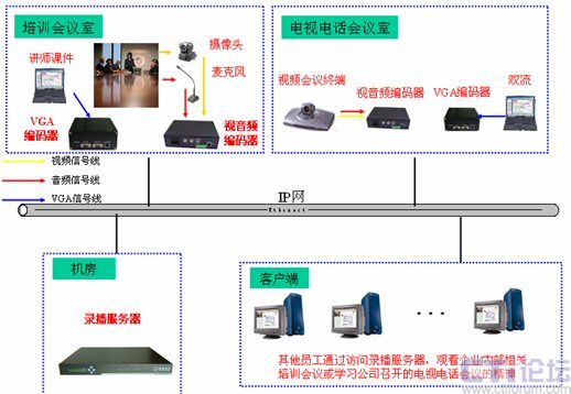 由于視頻會議系統(tǒng)沒有覆蓋公司內(nèi)所有的會議室,因此這些會議室召開的會議就無法進行直播,而借助于多媒體錄播系統(tǒng)就可以很好的解決這一缺陷。通常將這些會議室中的攝像頭和麥克風(fēng)接入到視音頻編碼器上,將講師電腦上的培訓(xùn)課件(如PPT,Word等文檔)內(nèi)容接入到VGA編碼器上,兩者將采集到的信號通過網(wǎng)絡(luò)發(fā)給錄播服務(wù)器,由錄播服務(wù)器進行處理后直播到各個客戶端,就可以很方面的對于任意一個會議室召開的會議進行錄播,隨時隨地對員工傳達會議精神。